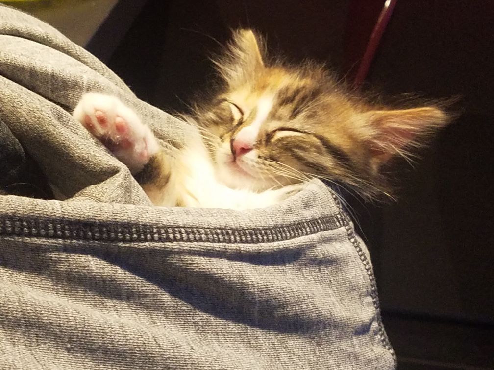 Un de mes chatons dormant dans une capuche :